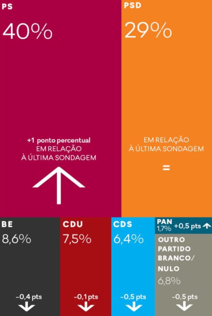Maioria de Esquerda = 56,1%. A diferença entre o PS e o PSD passou para onze pontos. Sozinho, o PS ultrapassa a PAF, que continua a descer e soma agora 35,4%. Clique na imagem do Expresso para ler melhor.