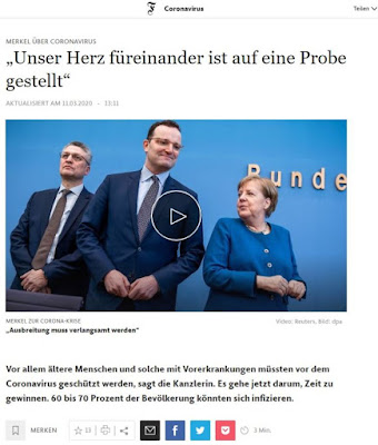 Chanceler alemã dixit — «O ponto é economizar tempo. 60 a 70% da população [alemã] pode ser infectada.» Ou seja, um número situado entre 49,8 e 58,1 milhões de pessoas.