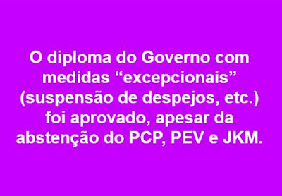 Entre outras medidas, o diploma impede despejos de habitação qualquer que seja o pretexto.