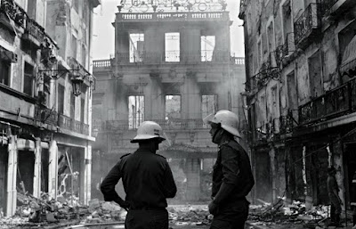 Nesse dia fui acordado muito cedo pelo Jorge — O Chiado está a arder. [...] O espectáculo dos Armazéns do Chiado a ruir era indescritível. Aconteceu o mesmo ao Grandella, mas dali não se via. A discoteca Valentim de Carvalho e a Ferrari ficaram reduzidas a carvão. O Martins & Costa, a melhor loja gourmet da cidade, desapareceu do mapa. Havia gente a chorar. [...] Voltei para o ministério com um nó na garganta. À noite, as imagens da RTP estavam longe de transmitir o horror. Durante anos, as pessoas subiam e desciam o Chiado em passadiços de ferro que foram montados na Rua do Carmo e na Rua Garrett. À hora do rush, essas plataformas oscilavam com o peso da multidão. Nos dias de chuva, o Chiado reproduzia o cenário fantasmático de Blade Runner. A reconstrução levou dez anos. Nesse intervalo, uma das poucas razões para voltar ao Chiado era o teatrinho que Mário Viegas dinamizou num anexo do Teatro São Luiz. Nuno Krus Abecasis, o presidente da câmara, convidou Siza Vieira a pôr de pé o novo Chiado, mantendo o desenho das fachadas originais. [...] — Eduardo Pitta, Um Rapaz a Arder, Lisboa: Quetzal, 2013.