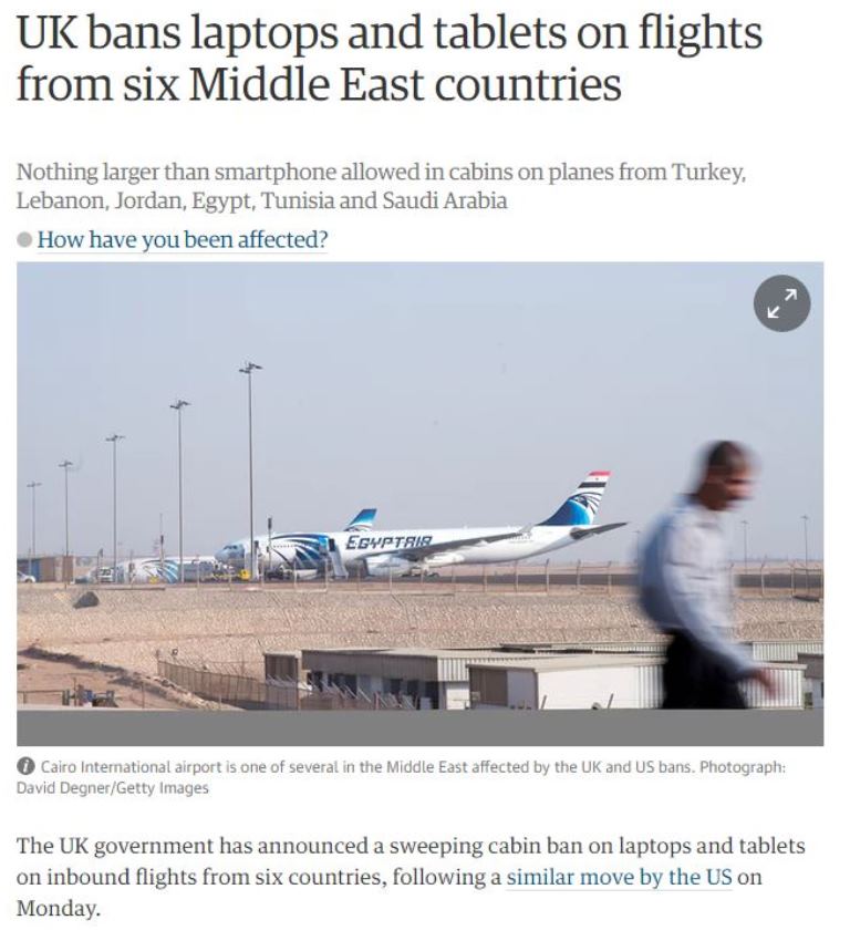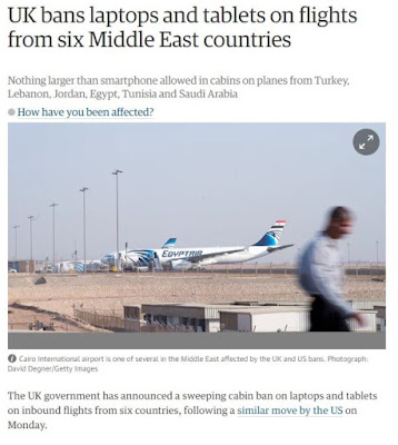 Anteontem foi Trump. Passageiros oriundos ou com destino a treze países não podem transportar computadores portáteis e tablets (vulgo iPads) na cabine do avião. A medida é taxativa para nove companhias de aviação, entre elas a Qatar Airways e a Emirates Airlines, mas, informalmente, foi sugerida a outras. Todos os instrumentos electrónicos de tamanho superior a um vulgar smartphone têm de ir no porão.