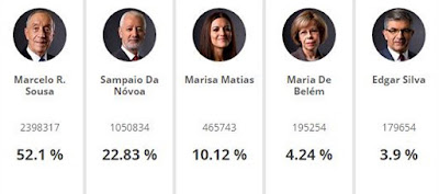 Marcelo é o novo Presidente da República. Ponto. Votei, com convicção e gosto, em Marisa Matias, na esperança de que pudesse disputar a segunda volta. A realidade trocou-nos as voltas. Se hoje à tarde me tivessem dito que Maria de Belém e Edgar Silva ficariam praticamente empatados com 4% dos votos, levava a informação à conta de boutade. Mas foi isso que aconteceu. O que me espanta é que alguém com o discurso de Paulo Morais possa ter mobilizado cerca de cem mil eleitores. A imagem mostra os resultados dos cinco principais candidatos, no momento em que estão por apurar duas freguesias.